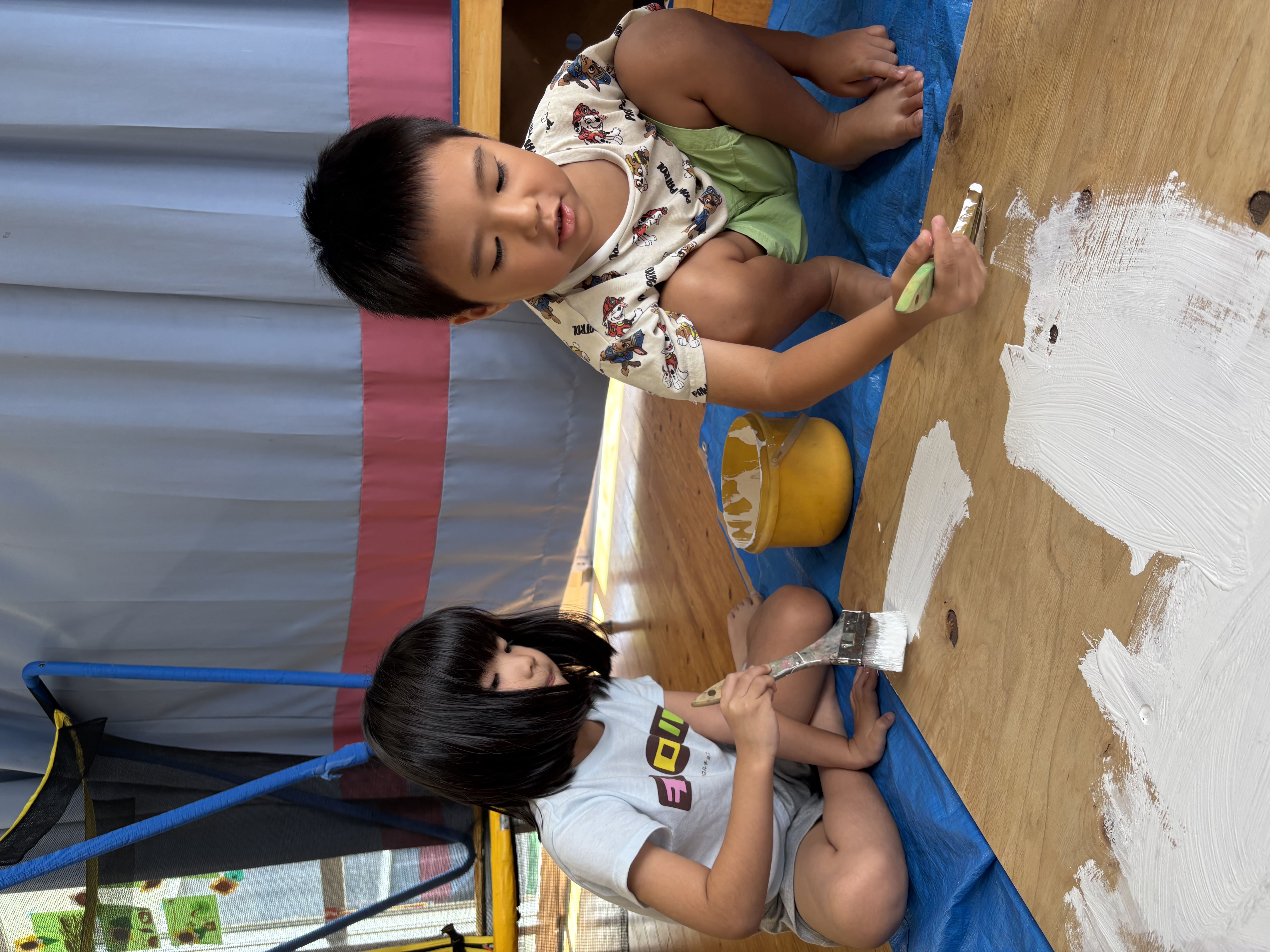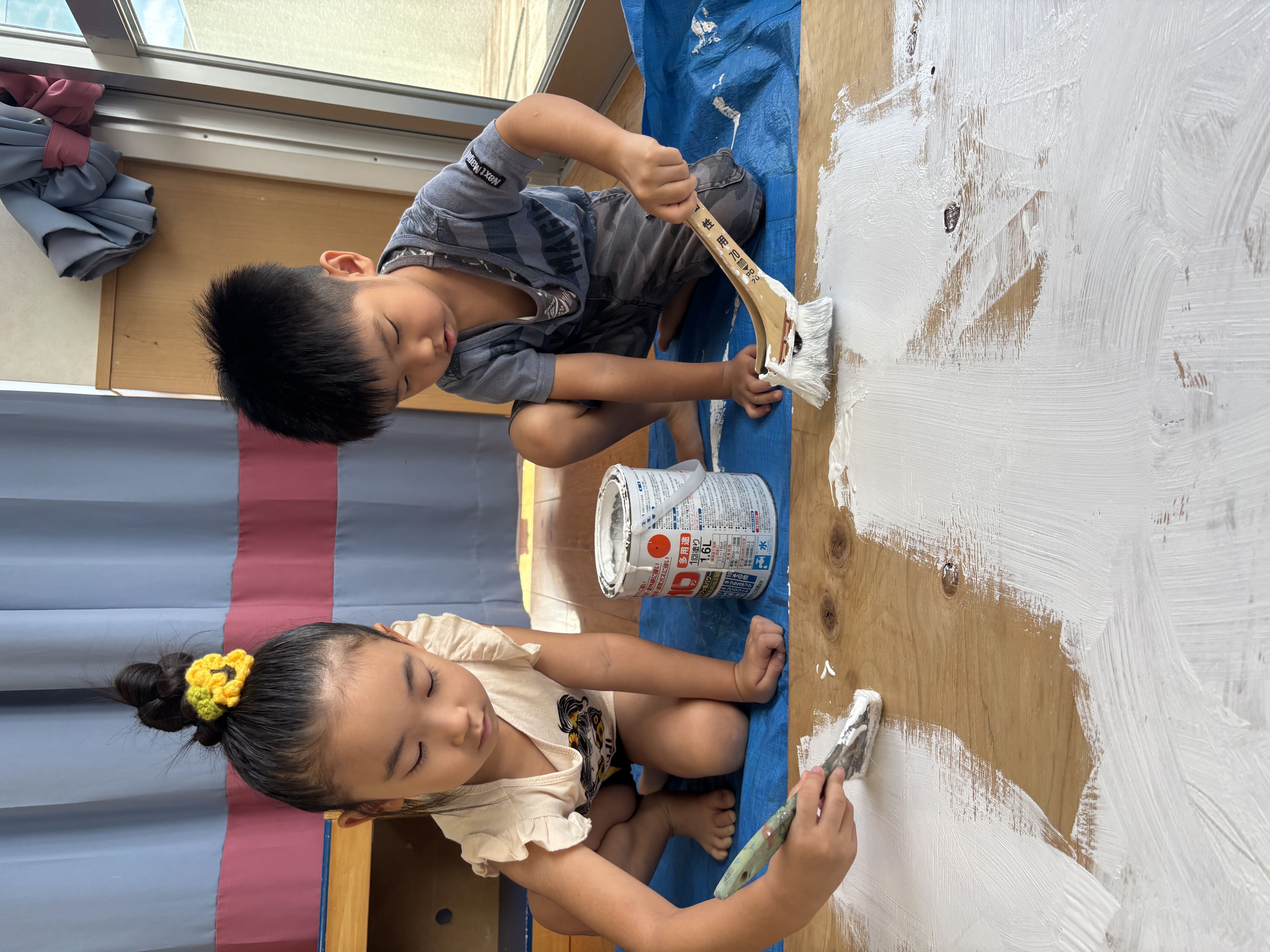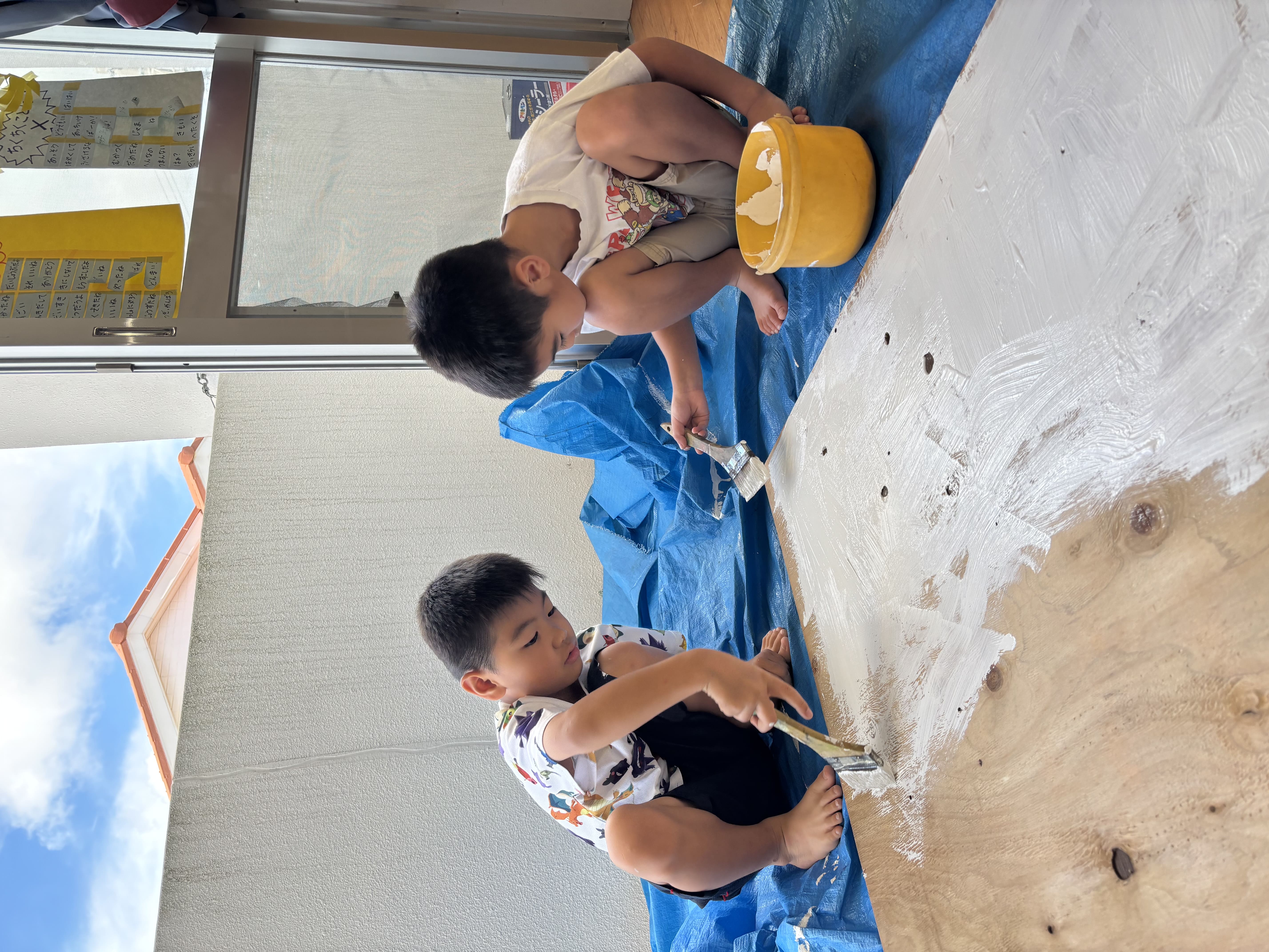今日からぞう組さんが掲示板づくりを始めました。まずはベニヤ板を白色に塗り、その上からさらに周りを水色、薄紫色、黄色、黄緑色に塗りましたよ!