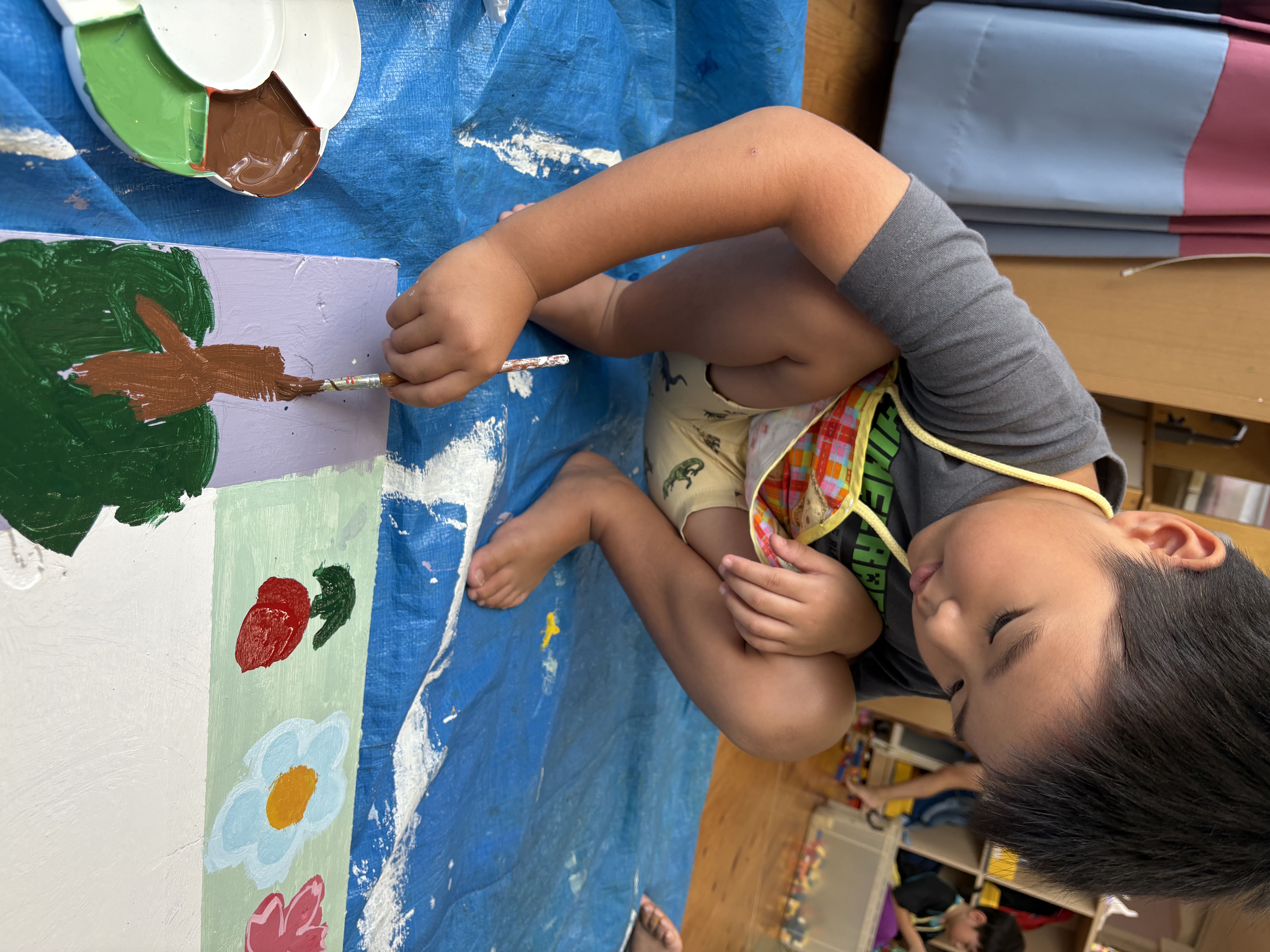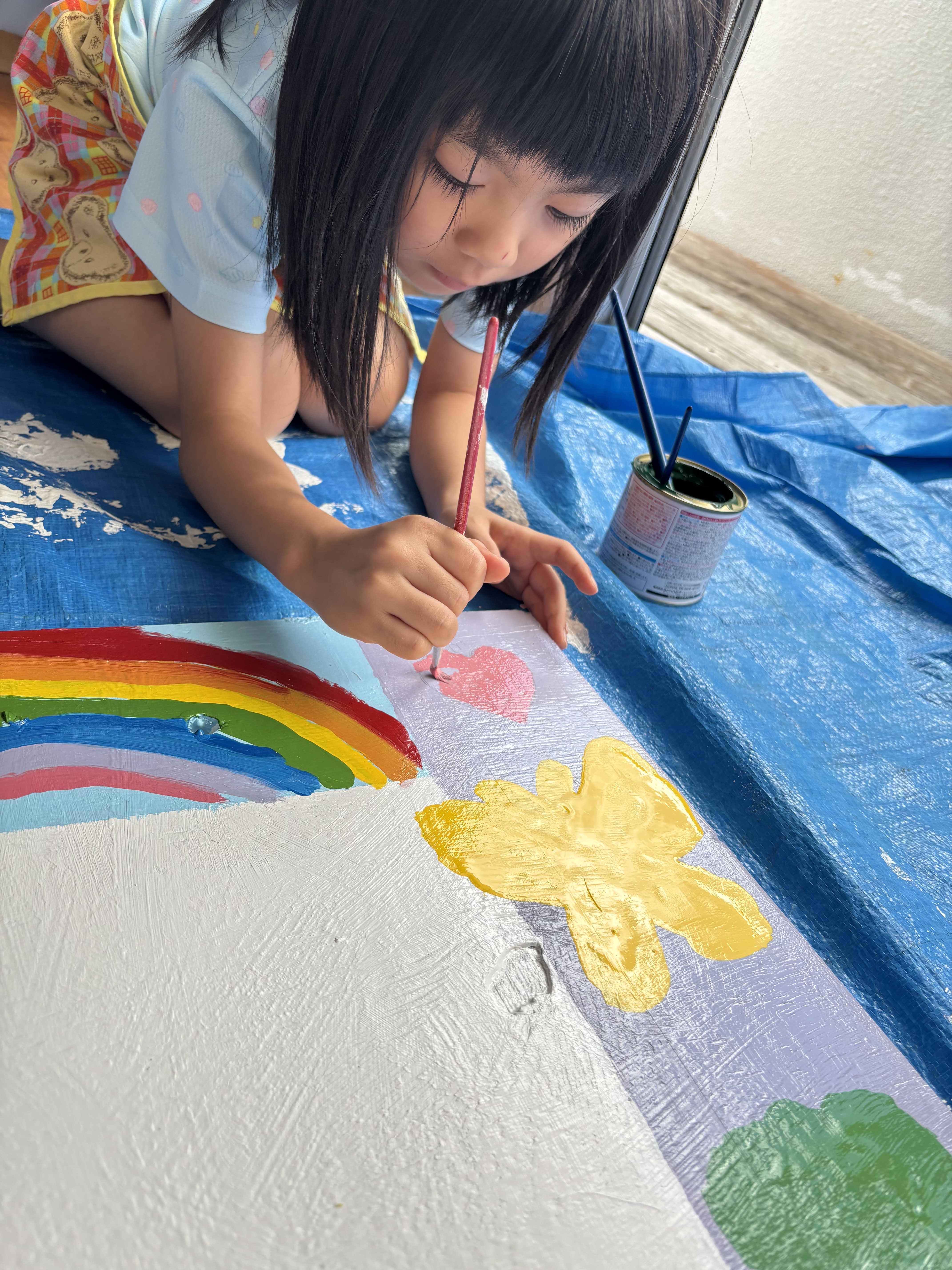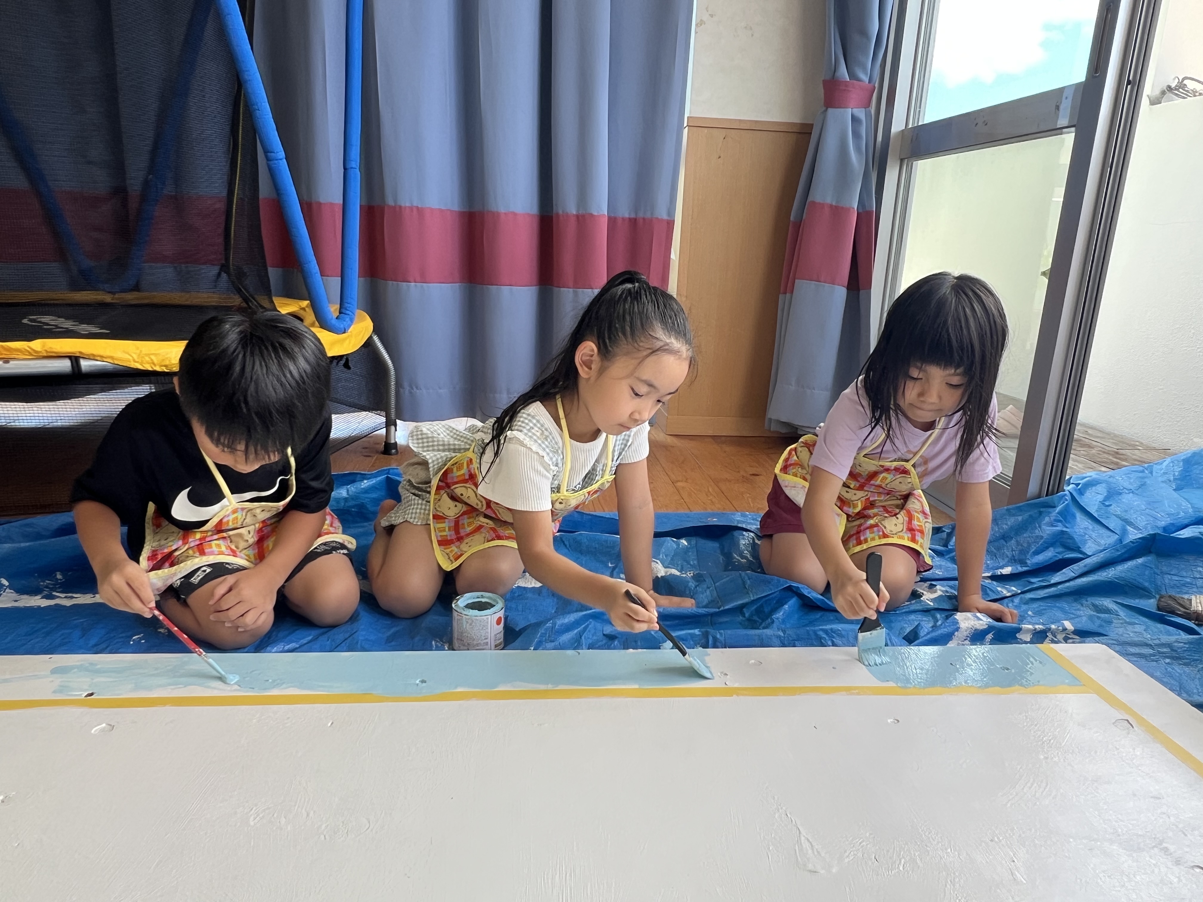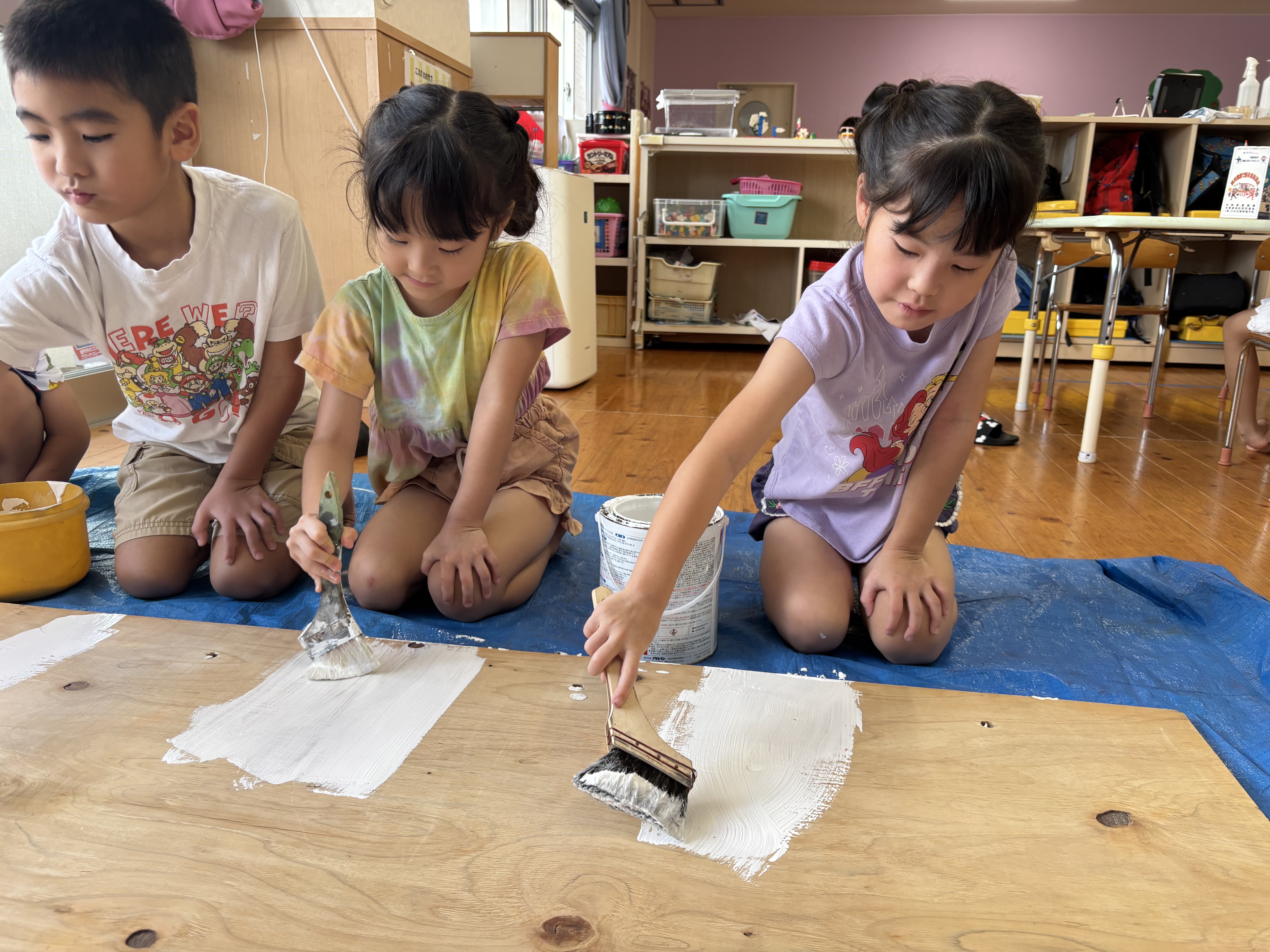 今日からぞう組さんが掲示板づくりを始めました。まずはベニヤ板を白色に塗り、その上からさらに周りを水色、薄紫色、黄色、黄緑色に塗りましたよ!
