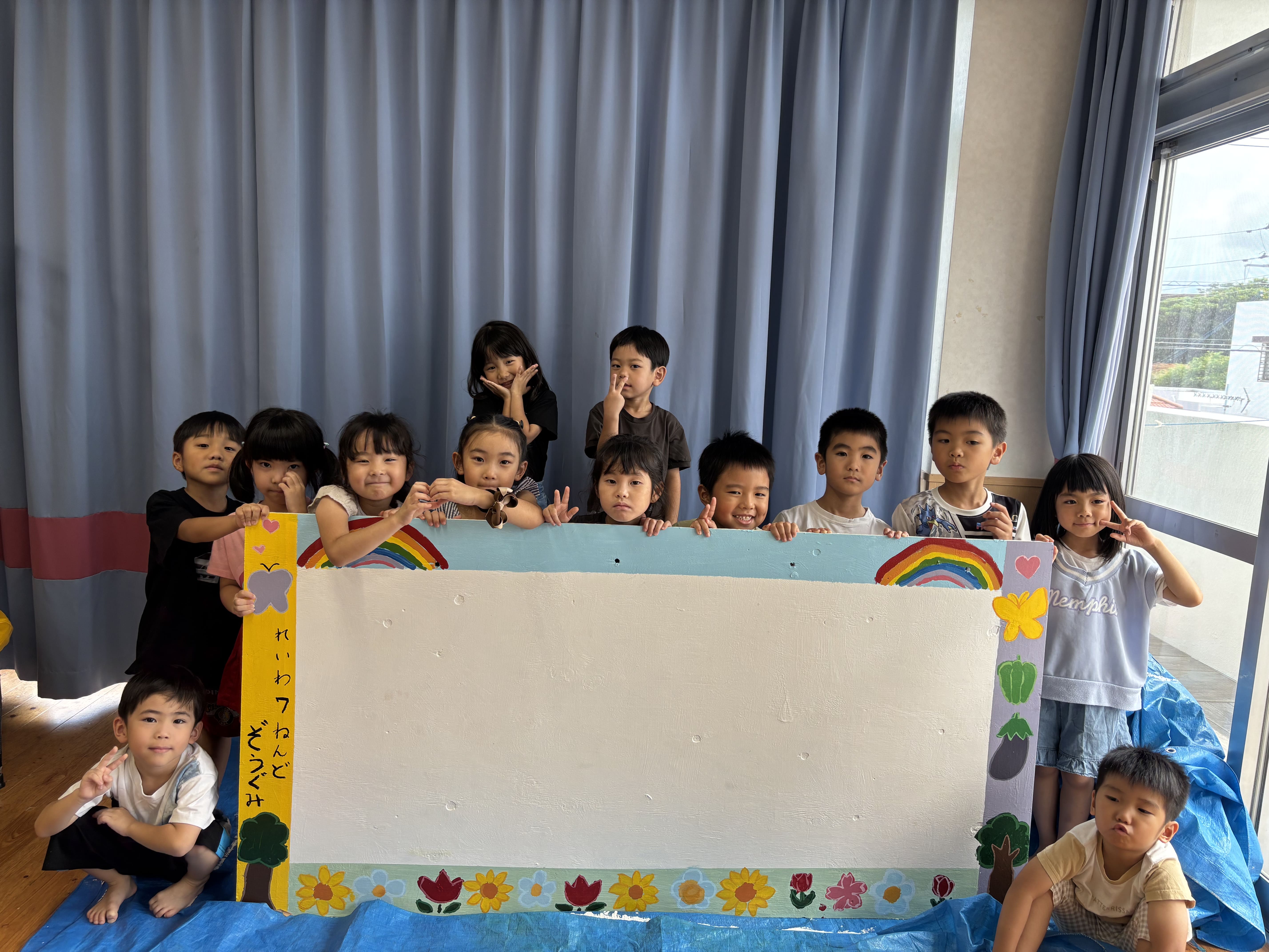 3日目の今日は、周りにお野菜やちょうちょを描いて、ついに完成させることができました!みんなで最高の掲示板をつくることができて嬉しそうなぞうぐみさんでした(^^)
